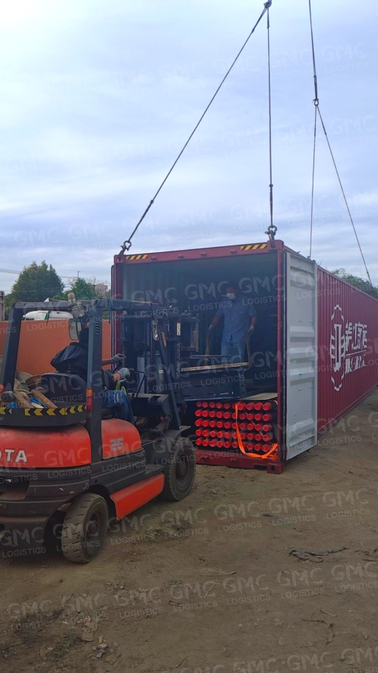 在了解需求後,我們將原先規劃的 #平板櫃 改為一般貨櫃處理,並同步協調就近的吊車、拖車及堆高機廠商進場支援,順利完成大型機具的卸貨任務👍 👍